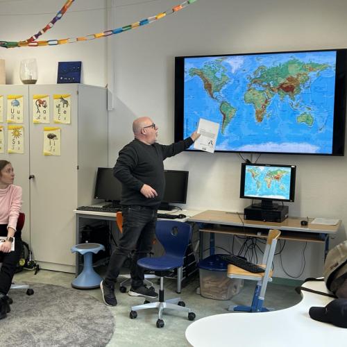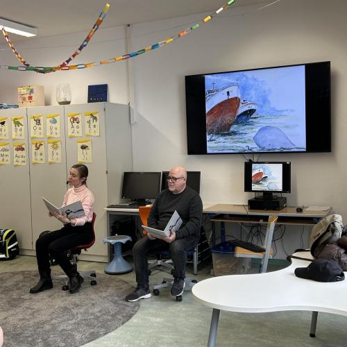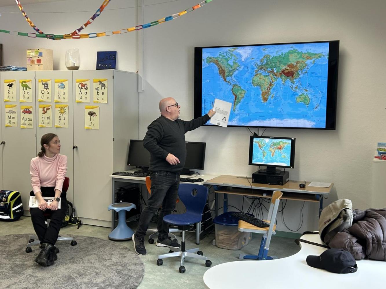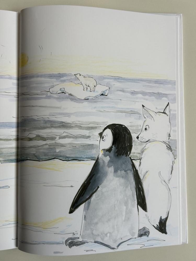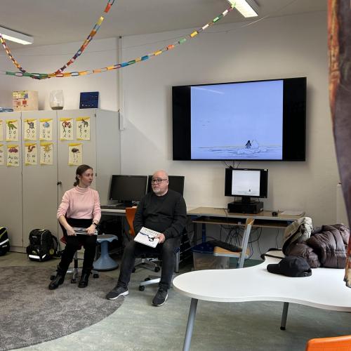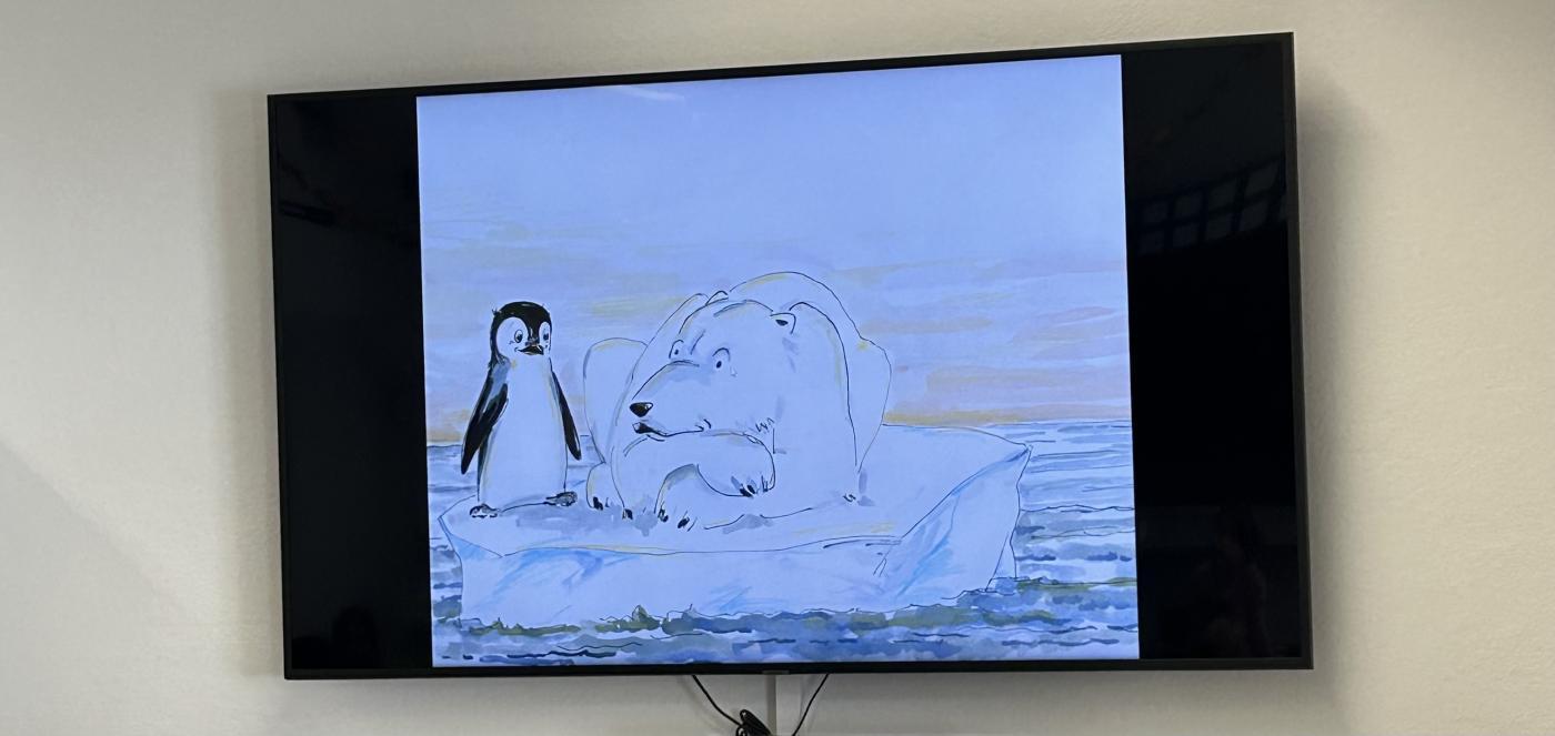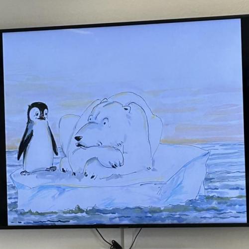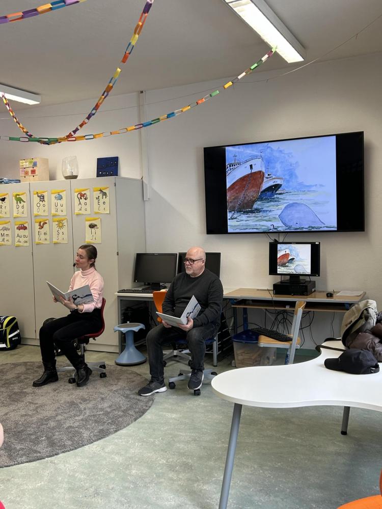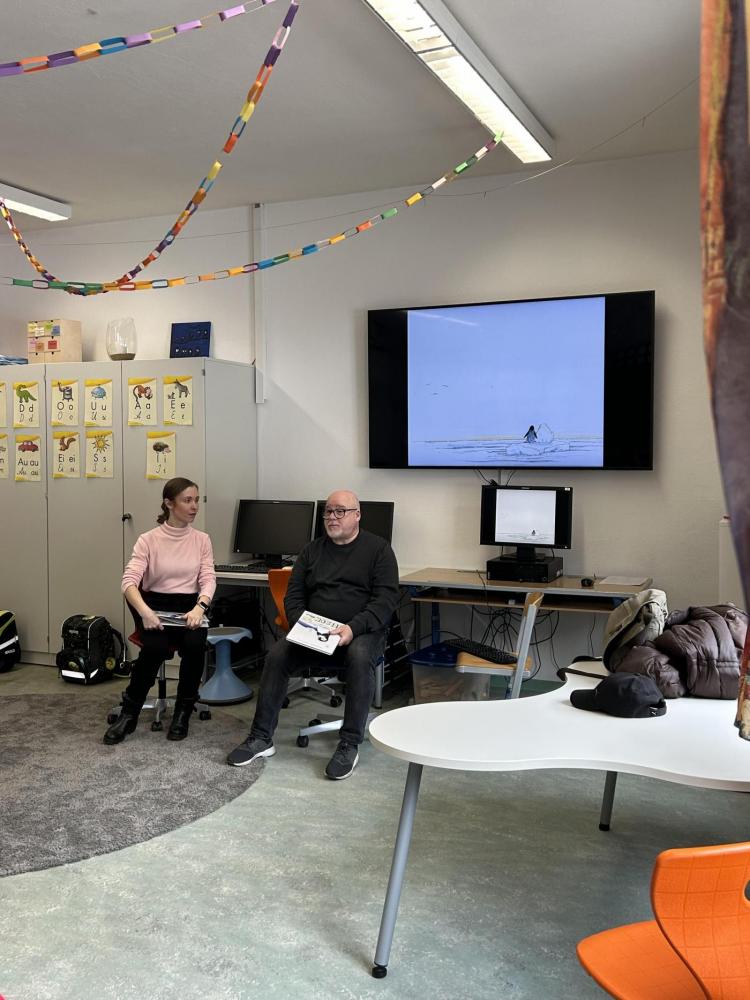 Nach der Pause besuchten uns Katharina und Peter und erzählten mit großer Begeisterung die Geschichte von "Nelson, der Pinguin". Nelson lebt am Südpol und begibt sich auf eine spannende Reise zum Nordpol, um die vom Aussterben bedrohten Eisbären kennenzulernen.